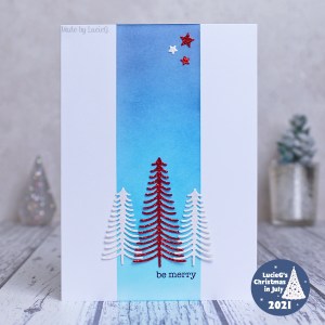 I used another recent purchase – the fabulous Bottlebrush Trees by Spellbinders and lots of different blue distress inks for the background.