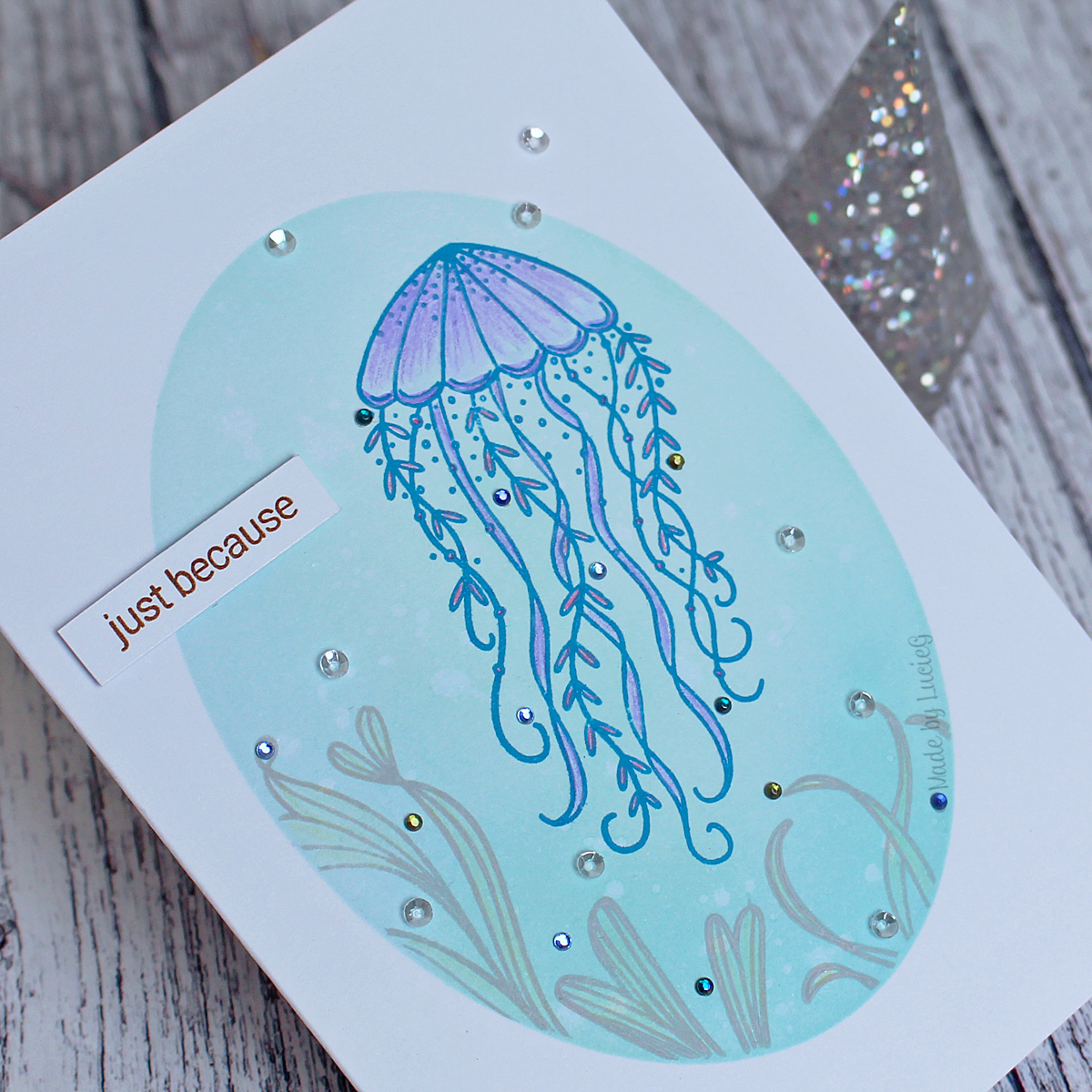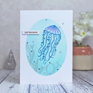 I just couldn’t wait to ink up the Jellyfish from the beautiful Swimming By set (30-845)! First of all, I blended some distress ink using an oval mask and stamped some seaweed (from Swimming By and Starfish Wishes (30-847) sets) before removing the mask. Then I stamped the beautiful Jellyfish using a light ink. I coloured in the image using my Twinkling H2Os before stamping the image again in Distress Oxide ink. This is when I realised that my colouring was far too soft, but I couldn’t use my Twinklings again because I didn’t want the oxide ink to bleed. So I turned to my Prisma pencils instead! Finally I added some sequin bubbles and a sentiment from the Snippets set (30-283)!