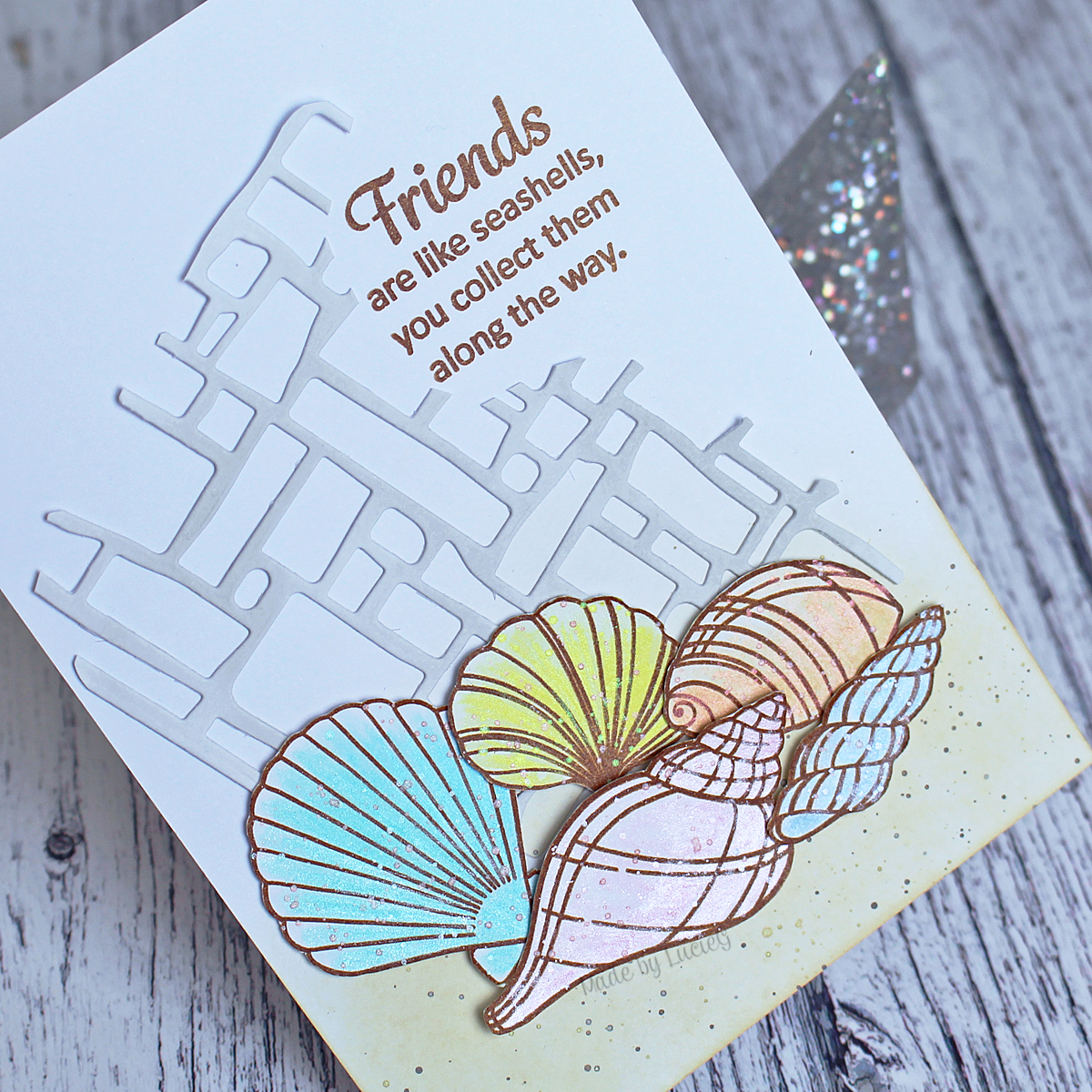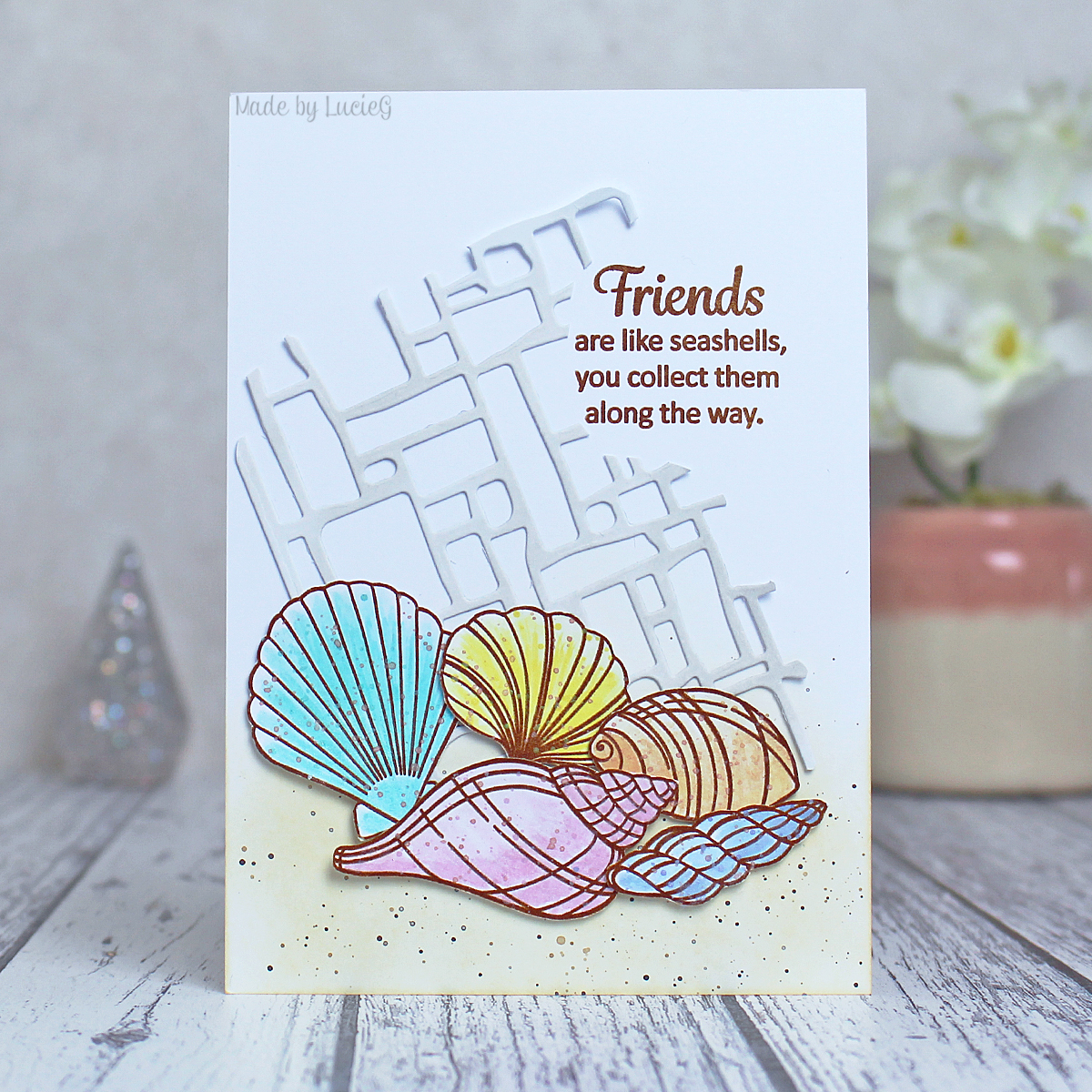 For my next card, I used the beautiful Seashells set (30-843). I love these shells so much! Super easy to fussy cut and a joy to colour! I wanted to add a little something different to the background so I cut up a die cut from the Wonky Squares die (51-424) to resemble a net!