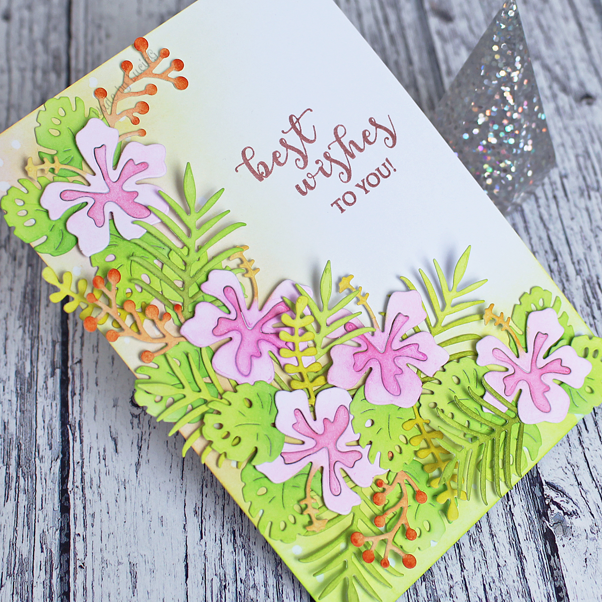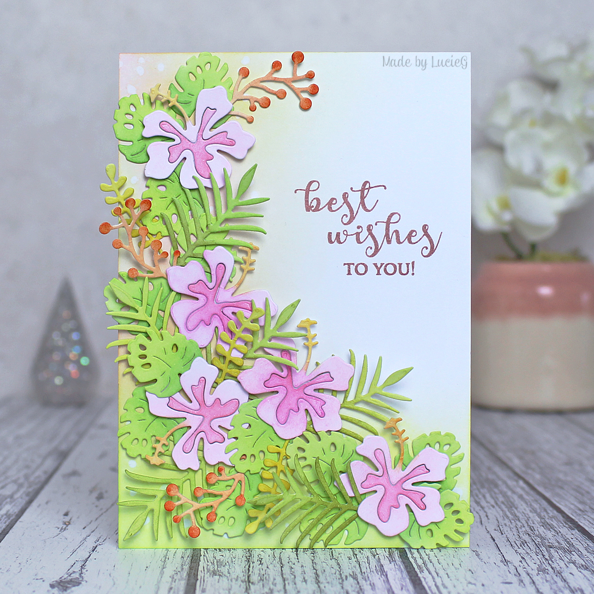 For my last card today, I used the fabulous Tropical Paradise dies (51-643) which I coloured using distress inks before adhering to a partially-blended background. The sentiment is from the Grateful Heart set (30-467).