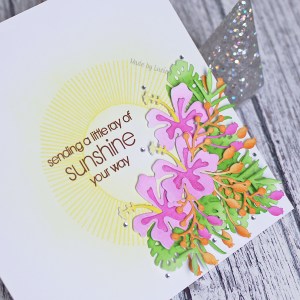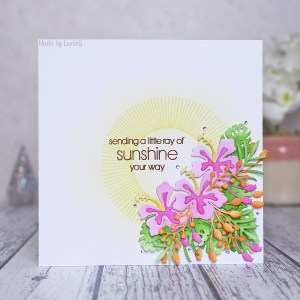 First of all, I stamped the Energized cling stamp (40-476) and lightly blended yellow ink around it. Next, I cut the Tropical Paradise dies (51-643) and coloured them using distress inks . Finally I added a sentiment from the Thinking of You set (30-825) and a few gems.