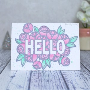 First, I embossed the Hello with a Bouquet of Flowers die by Pinkfresh Studio onto white card before colouring the leaves and petals and trimming round the edge of the die cut. I then used the die to cut some grey cardstock and adhered the die cut to the coloured image. Finally I adhered it to my card base. Quite a simple card, but you would not believe how long it took me to colour that image – so time consuming!