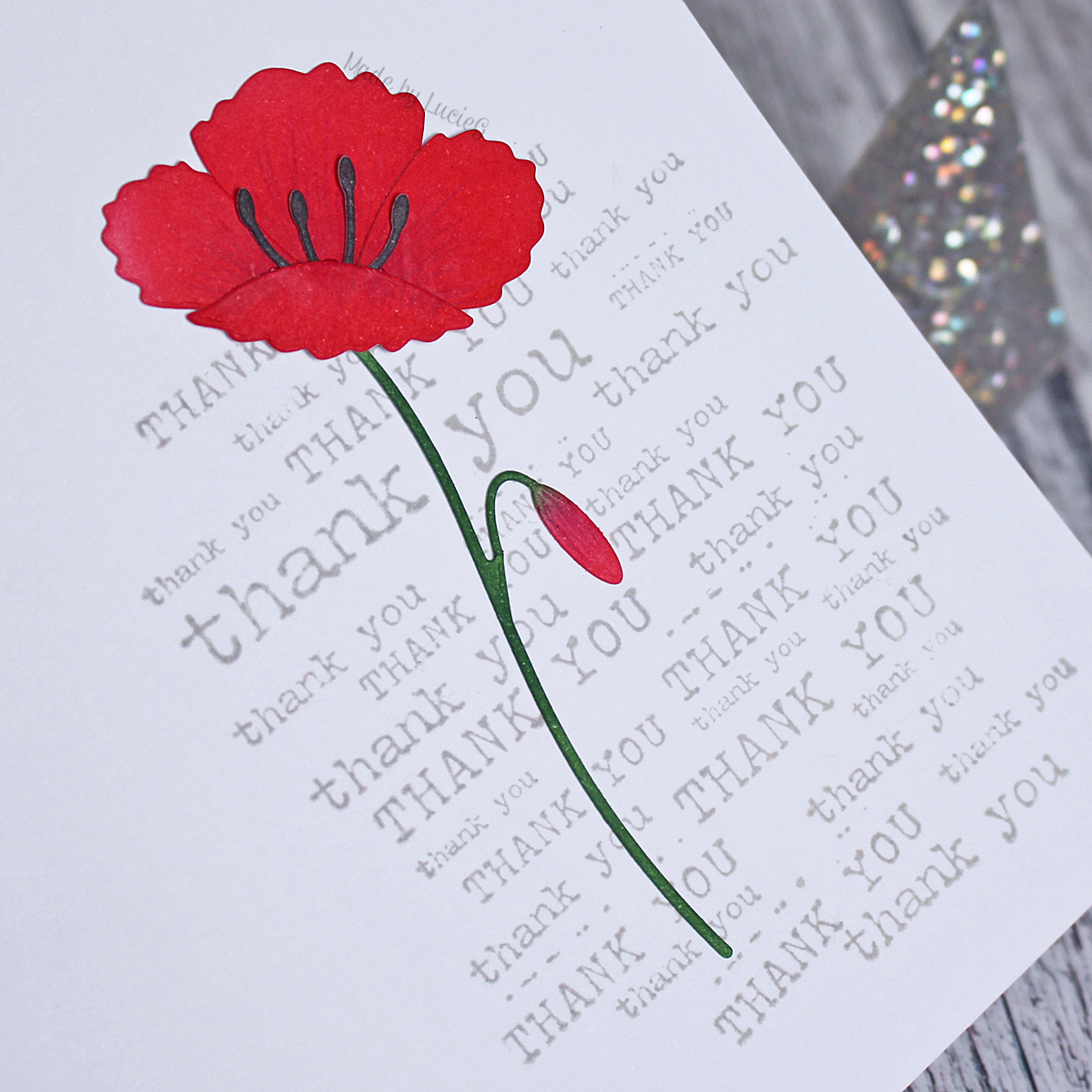 I knew I wanted to use one of my old wood-mounted stamps for the sentiment/background section so once I had decided that, I was on a mission to find an image that wouldn’t obscure the large ‘Thank You’ in the background. I thought this beautiful Poppystamps Blooming Poppy fit beautifully!