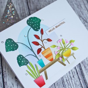 I then created an ink-blended circle with the Circle Extraordinaire stencil on my card base and adhered my plants, placing a few of them on a couple of images cut from the Cat and Plant Perches Dienamics set.