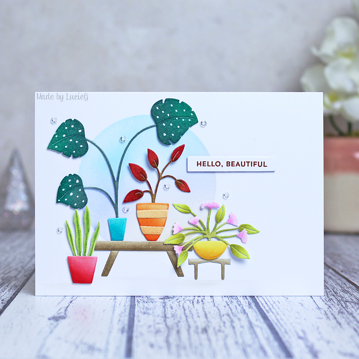 I then created an ink-blended circle with the Circle Extraordinaire stencil on my card base and adhered my plants, placing a few of them on a couple of images cut from the Cat and Plant Perches Dienamics set.