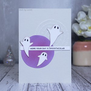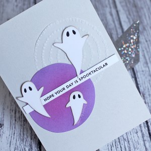 I had lots of ideas for this sketch and was about to create an autumnal card, when I suddenly decided that I wanted to use purple! So I pivoted to a Halloween card! It gave me a chance to use the little ghosts from my brand new Open House Boo die set from Spellbinders. I have more than enough ghosts already but I couldn’t resist! I added an ink blended circle, cut with an irregular circle die by Simply Graphic. The second circle is vellum embossed with a Carabelle Studio folder and then hand cut – I wanted to match the irregular die cut! The sentiment is from a new My Favorite Things set