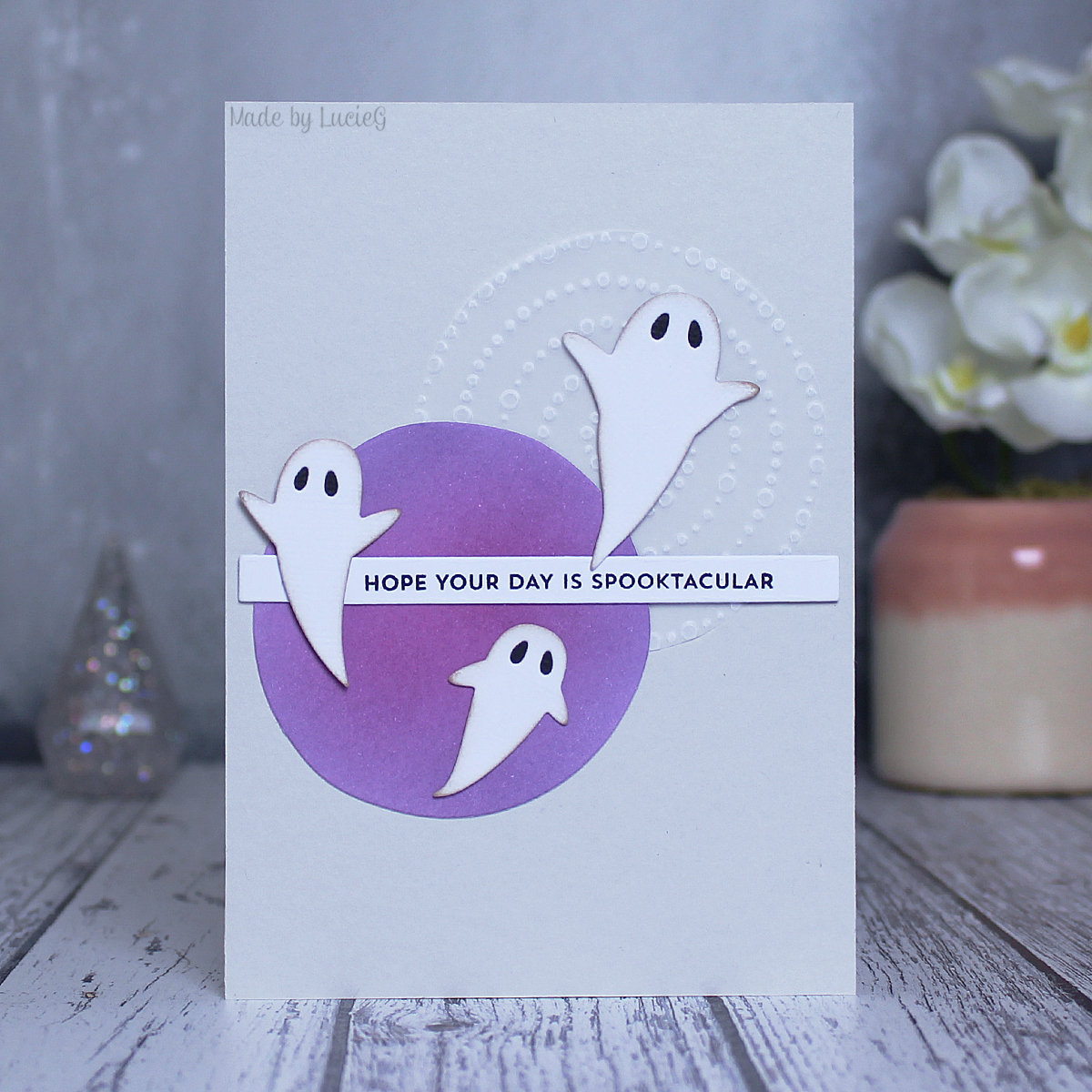 I had lots of ideas for this sketch and was about to create an autumnal card, when I suddenly decided that I wanted to use purple! So I pivoted to a Halloween card! It gave me a chance to use the little ghosts from my brand new Open House Boo die set from Spellbinders. I have more than enough ghosts already but I couldn’t resist! I added an ink blended circle, cut with an irregular circle die by Simply Graphic. The second circle is vellum embossed with a Carabelle Studio folder and then hand cut – I wanted to match the irregular die cut! The sentiment is from a new My Favorite Things set