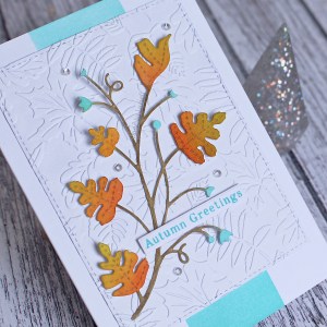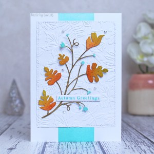 Following the sketch, I blended a strip using Salvaged Patina distress ink, making sure I blended more heavily at the bottom of my card so that there would be a subtle ombre effect. I embossed a panel using the Spellbinders Falling Leaves embossing folder and then coloured the beautiful Poppystamps Monterey Vine die using regular distress inks and adhered it to my card. Finally I stamped a Hero Arts sentiment to complete my take.