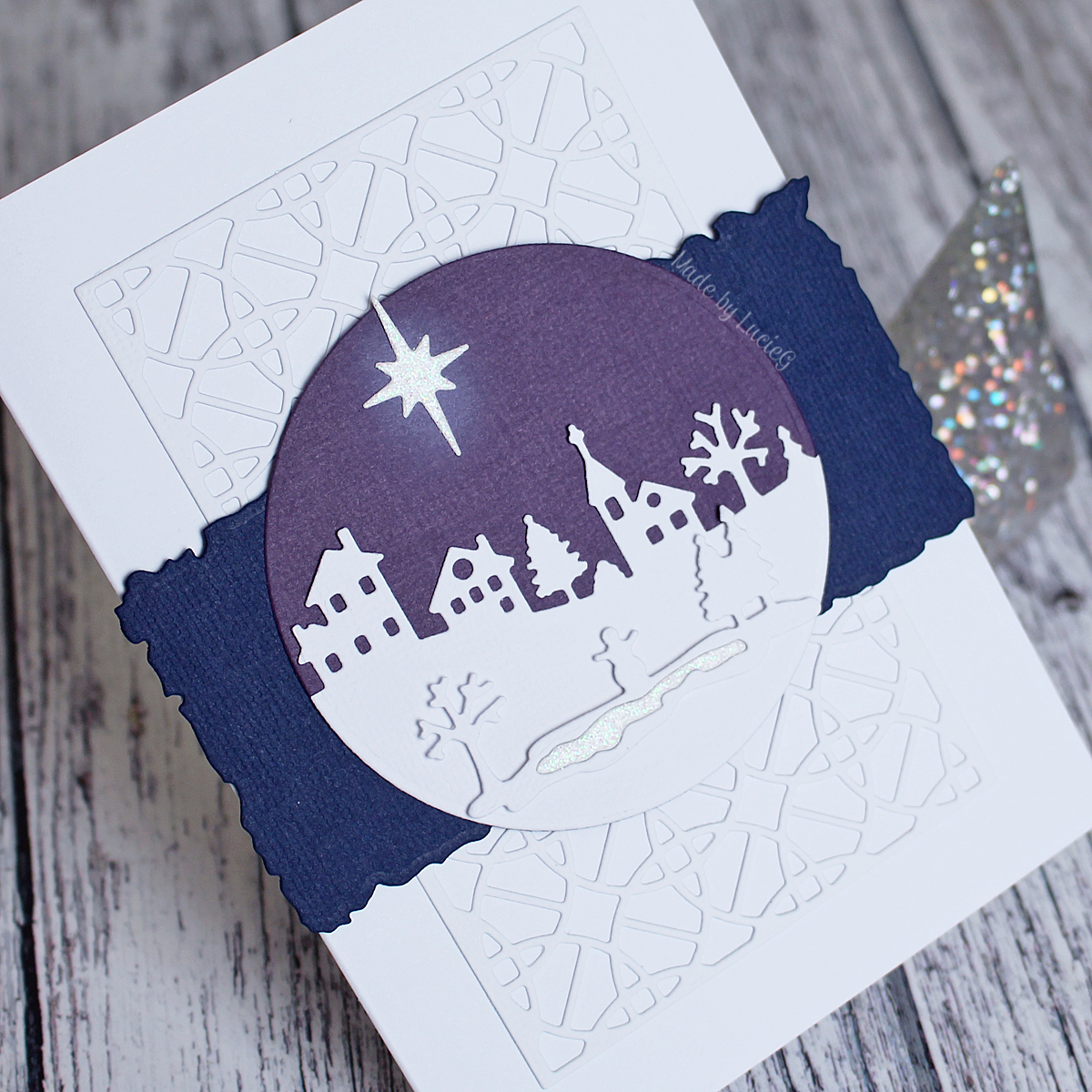 Following the sketch, I cut the Geometric Circles background die (51-644) and snipped it in half so I could create a longer background panel – I knew I could hide the gap with the other layers. Next I used a die from the Antique Frame set (51-397) to cut some navy card and adhered it on top of the background die – once again I had o cut this in half so I could extend it across the width of my card base. I then adhered a purple circle die cut on top, hiding the gap in the navy strip. I cut the village and pond from the winter village set (51-396) and adhered them to the circle. I added a star from the Christmas Wonderland set (51-562), cut from glitter card (which I also used for the pond!).