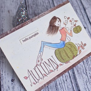 I’ve been wanting to ink up and colour the beautiful Autumn Vibes clings stamp by Penny Black (40-786) for a while now and I thought this week’s combo would be perfect for the stamp. I coloured the image with my Twinkling H2O paints, but didn’t like how my gold paint looked… So, I turned to some glitzy golden paper, stamped and cut out the pumpkins and did some paper piecing! the sentiment is from Penny Black’s Pumpkin Stack mini set (30-855).