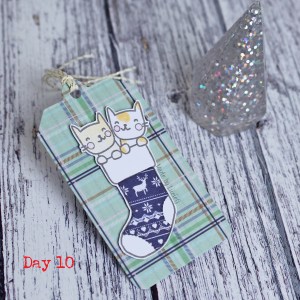 This was pretty challenging for me but I remembered my Poppystamps Cat Friends stamp set and decided to take Channin’s inspiration and the kitties in stocking image for my tag. I adhered some patterned paper to the main section of the stocking – haven’t done paper piecing for a while and this was fun!