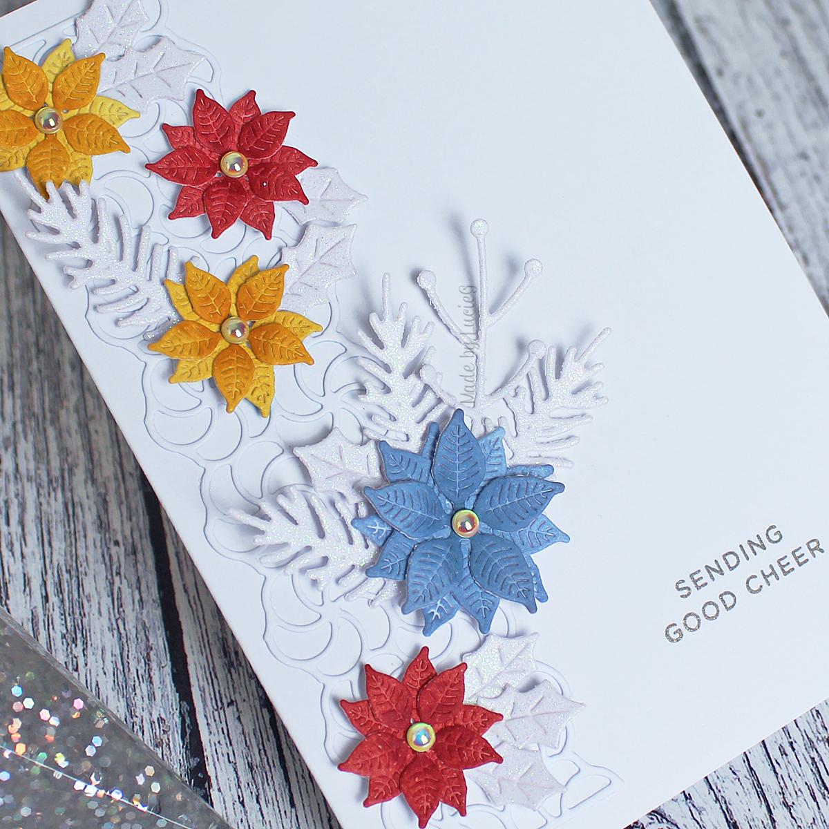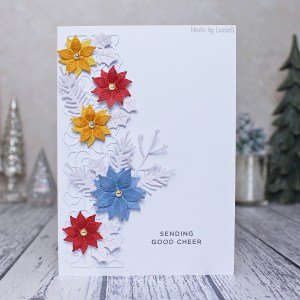 To ground my images a little, I started by the pretty Poppystamps Swirly Curl Border outline on my card base. Then I made three blended distress ink panels using ‘dirtier’ shades of the challenge colours (Stormy Sky, Fossilised Amber and Fired Brick) and then cut them with the poinsettia dies from the Spellbinders Christmas Blooms set. I also cut foliage from white glitter card and then adhered them all to my card. I added a few gems for poinsettia centres and a Simon Says Stamp sentiment to complete my card.