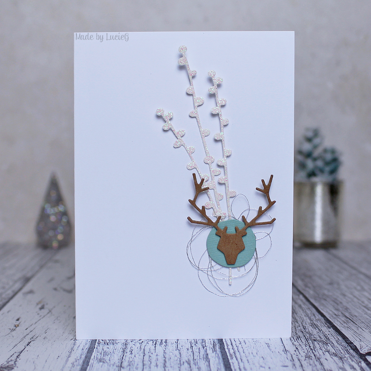 This time, we had to include at least one animal so I chose the fabulous SG deer – I just love his antlers, don’t you? I added a few SG berry die cuts and a bit of silvery thread to complete my take.