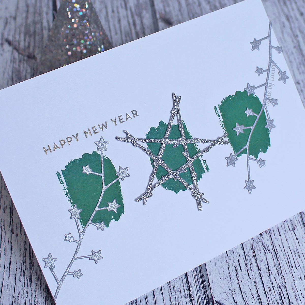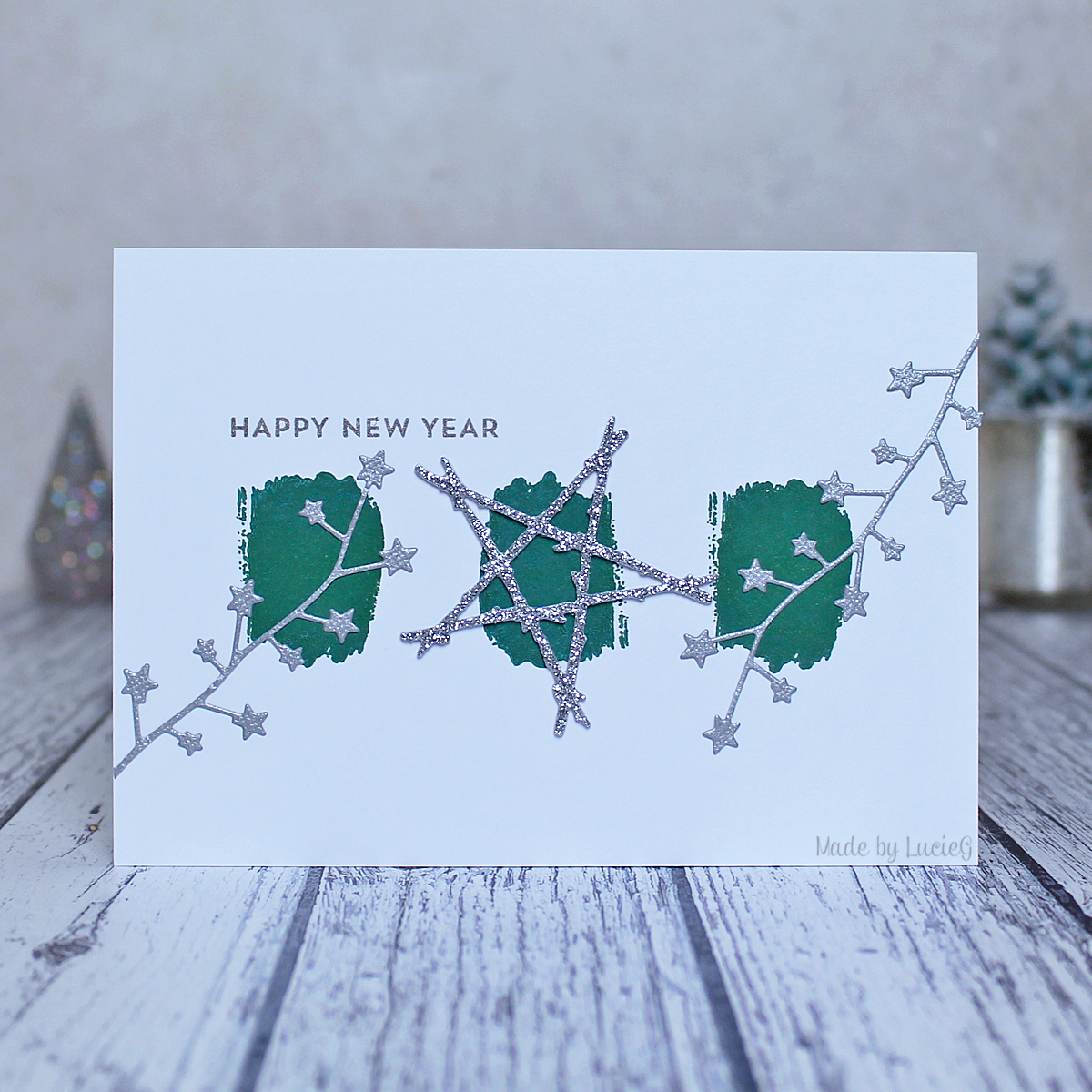You know how I love a good sketch challenge and this one was particularly interesting because the sentiment was placed above the images! I loved Cecile’s interpretation and decided to stamp three blocks of colour to ground my images. I added a few die cuts and a New Year’s sentiment.
