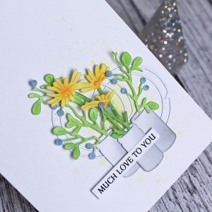 First I smooshed some yellow ink onto my card base and then cut images using the Frosted Greens set (51-710), Daisy Delight (51-676) and the Autumn Decor set (51-653). I coloured them with distress inks and added detail with coloured pencil. As I was arranging the images, I felt that the background needed a little something extra so I added a couple of round frames from the Framed die set (51-622).