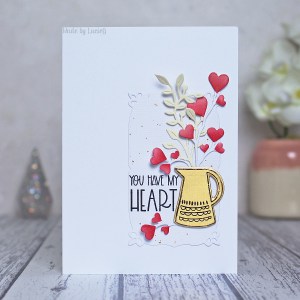 First I stamped a jug from the Garden Fresh stamp set (30-816) on some gold cardstock and set it aside to dry for a while before cutting it out with the coordinating die (51-703). Next, I die cut a panel using a die from the Graceful Stackers set (51-658) and splattered some gold paint across it, after masking a small section that I planned to use for my sentiment. I then cut images using the Ardor die (51-097) and one from the Garden Greens set (51-67652). I coloured Ardor with some distress ink, and masked each heart to create that inked point in the branch.