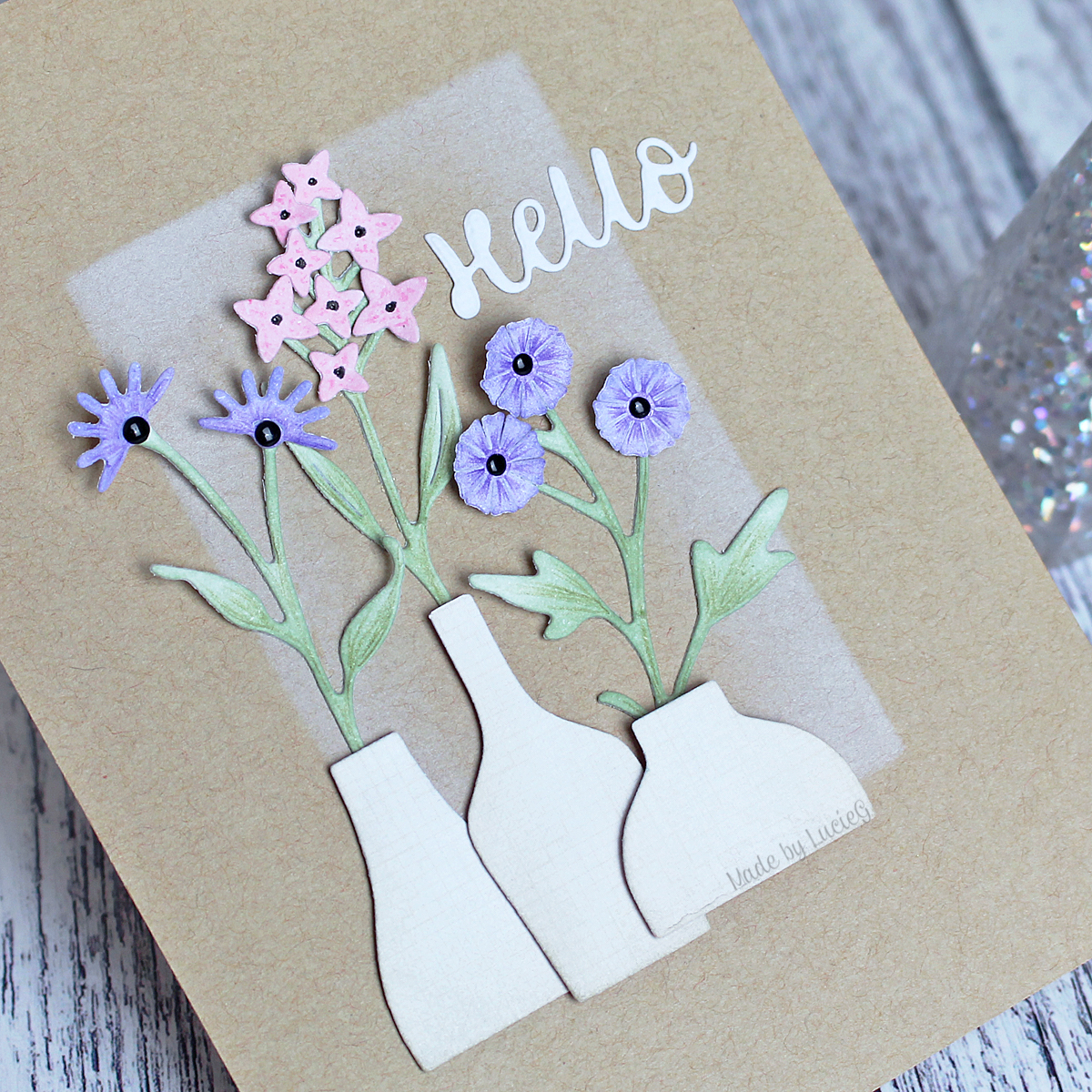 I coloured the wonderful Wildflower Botanicuts by the Greetery with some distress ink and added Paper Smooches vases which I cut from some patterned paper. The sentiment is by Karen Burniston.