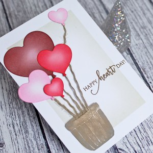 First I die cut a selection of hearts from the Heart Balloons die set (51-493) and coloured them using distress inks. I stamped the pot from the Timber & Tidings cling set (40-795) using Frayed Burlap distress oxide ink and fussy cut it. While it was drying, I sponged a soft background on my card base and then arranged all the balloons and twine. After adhering the pot, I added a sentiment from the Words Sweet stamp set (30-525) – it’s actually my favourite sentiment for Valentine’s cards!