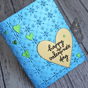 I left the cardstock dry and die cut the hearts using a few Memory Box heart dies. I then adhered the Poppystamps Doodle Happy Valentine’s Day on the gold heart before sticking all the hearts onto the embossed base. I have to say this was very difficult to photograph but I got there in the end!