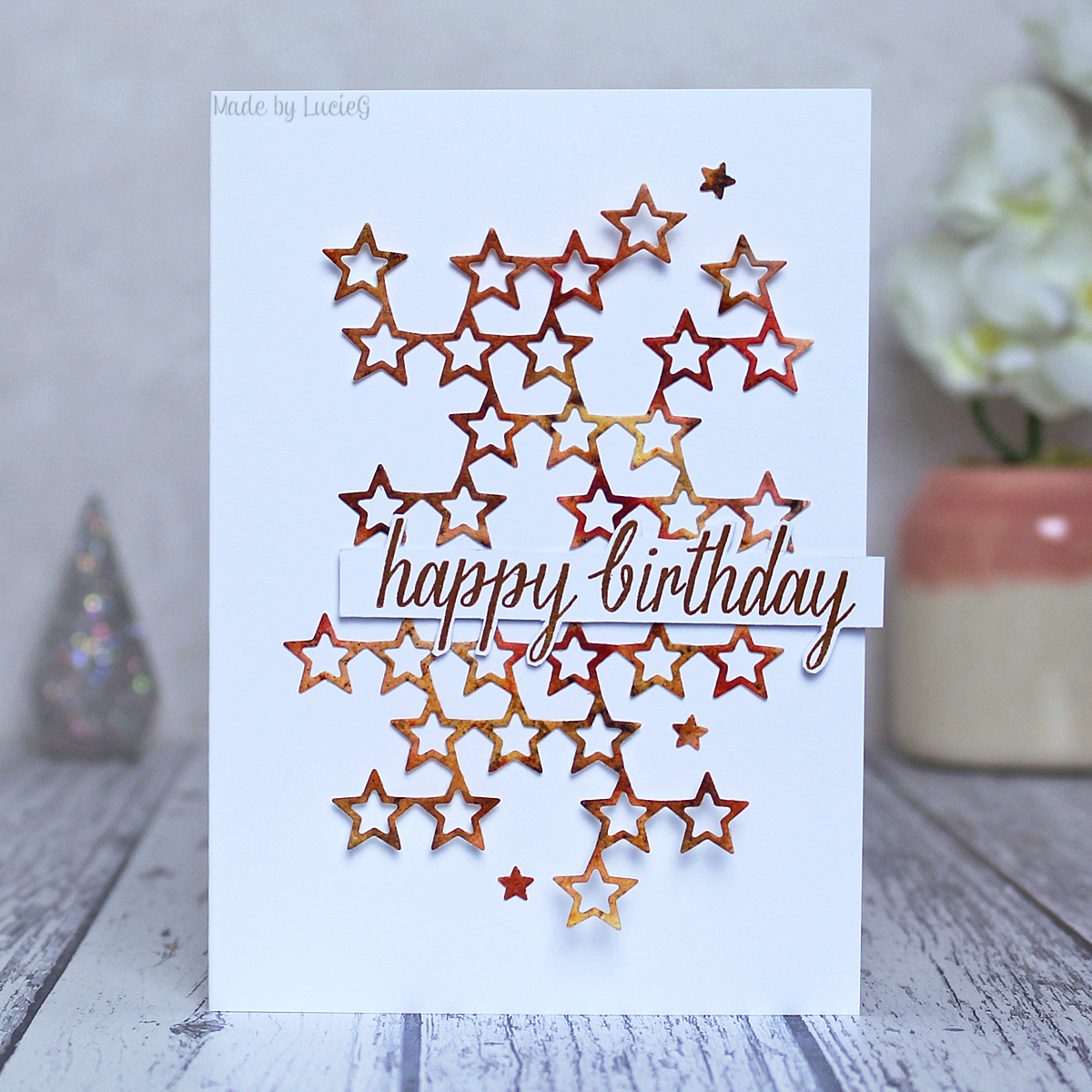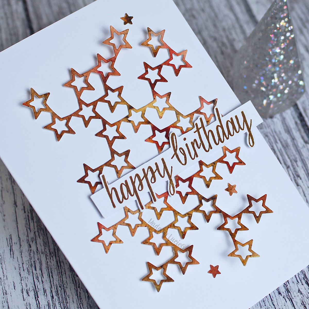 I often use greens and blues for male cards, but today I decided to use a different colour palette and used an older Simon Says Stamp background die (called Stacked Stars) to cut a panel I’d created with Color Bursts.
