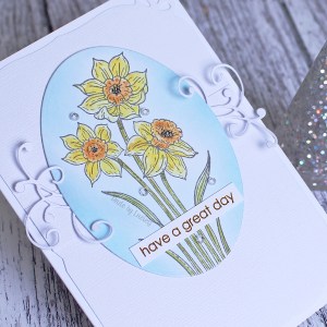 Your sweet coloring on the daffodils is so lovely. The flourishes on the panel and beside the oval add a beautiful flair! Thanks for playing along with us at The Paper Players!