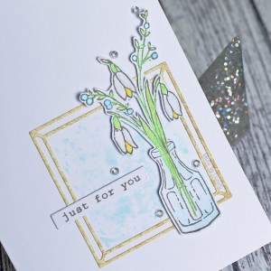 Although my snowdrops have mostly faded away, I really wanted to use the beautiful snowdrop image from Penny Black’ s Wintry Whites mini stamp set (30-634)! I fussy cut and coloured the image with my Twinkling H2O paints. I then smooshed some distress ink onto my card base, added a frame from the Framed die set (51-622) and a sentiment from the Fragrant Friends stamp set (30-807).