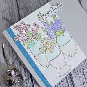 I used the sentiment from last year’s Spring Day set (30-805) and fussy cut around it. I adhered it onto my card base – it’s actually strategically positioned to hide part of the foliage from the fourth egg cup!