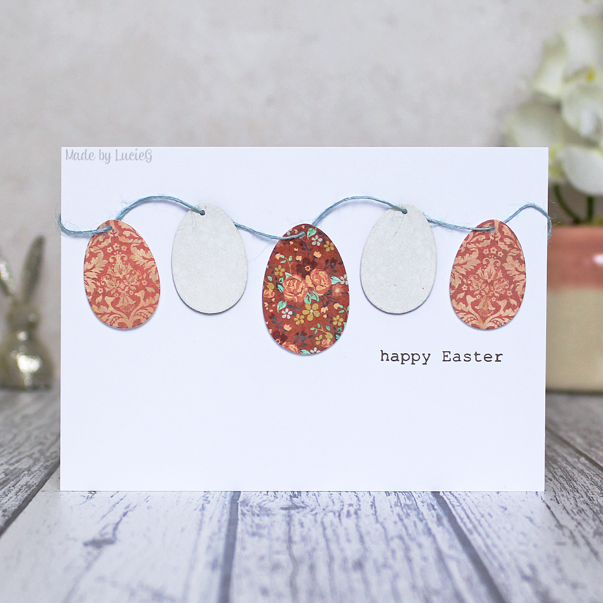 I was inspired by a CAS card that Fraeulein.diy shared last year on Instagram and pulled out some pretty papers from Basic Grey’s Lucille collection. I used Memory Box dies to cut the paper eggs and then threaded some thin twine before adhering the eggs to the card base. Finally I stamped a Memory Box sentiment to complete my CAS card.