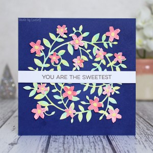 Eventually, I decided to watercolour the beautiful Memory Box Jasper Leaves die with Cracked Pistachio and Squeezed Lemonade Distress Oxide inks. Then I smooshed some Abandoned Coral Distress Oxide and used it to cut flowers from Spellbinders’ Mini Fall Blooms die set. I felt my leaves didn’t have enough yellow, so I added yellow centres to each flower.