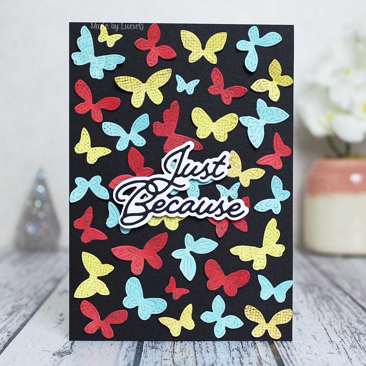 After prevaricating for far too long, I went for a simple take on the challenge colours using some of my patterned paper mountain and all the butterflies from the new Intricate Mini Butterflies set by Memory Box. The sentiment is also by Memory Box.