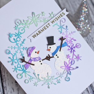 I pulled out an oldie but goodie Memory Box die called Frostyville Wreath and used it to cut a reject distress ink background! I added the Dancing Snowmen (also Memory Box/Open Studio) and a sentiment by My Favorite Things.
