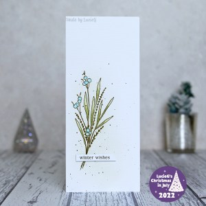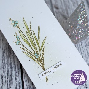 I decided to use a mini slimline card for my card today and applied a light layer of Old Paper distress ink to my card base. Next I inked up the pretty wintery bouquet from the Beautified stamp set (30-870) using my Frayed Burlap Archival ink. I lifted the colour from the leaves and berries using some water. I coloured in the image using my beloved Twinkling H2Os and then splattered some brown paint across the card base.