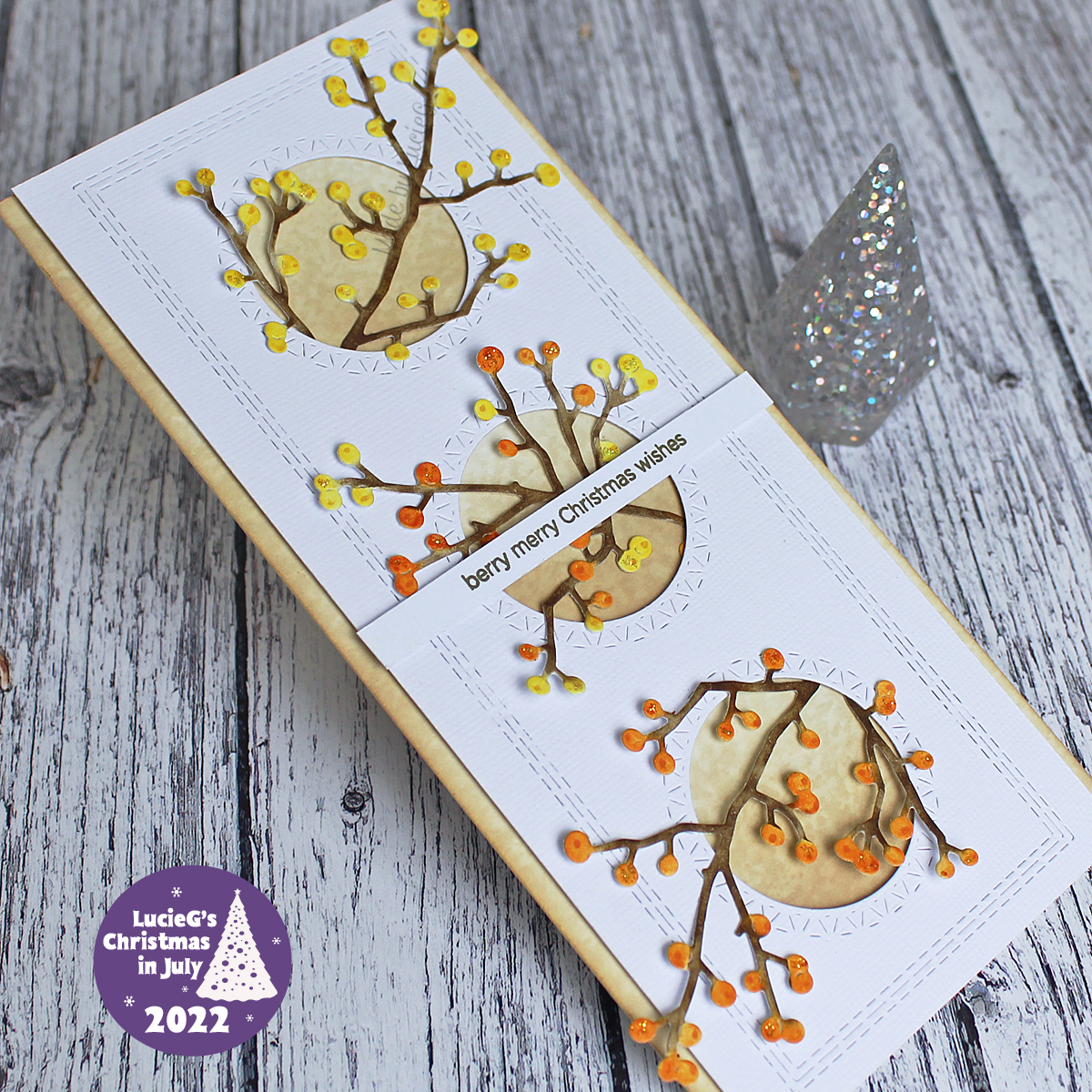 I decided make a slimline card using the Slimline Medley die set (51-718) which I cut from white cardstock. As I wanted some shading in each of the circular windows, I sponged my card base using Vintage Photo distress oxide and adhered the frame section using foam tape. I then cut the beautiful Berries die (51-712) three times and coloured with distress inks before adhering in place.