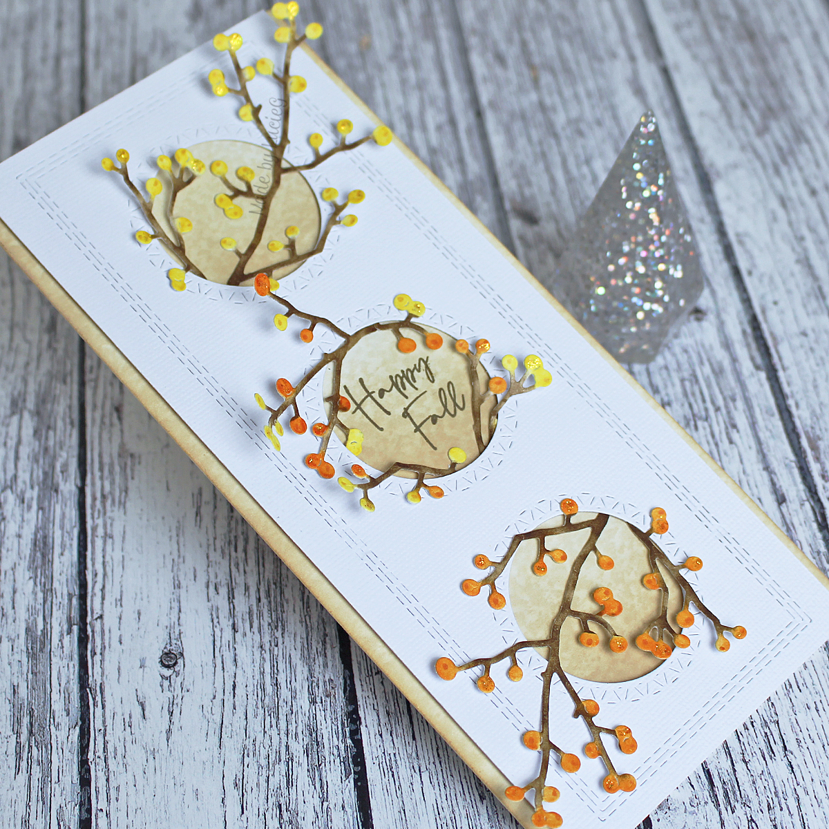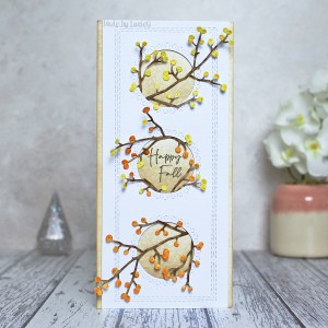 I had made the slimline card using the Slimline Medley die set (51-718) cut from white cardstock. I removed the sentiment and the Berries die cut (51-712) from the centre circle and added a sentiment from the Autumn is Calling stamp set (30-863). I then cut up the berry branch and popped it around the sentiment.