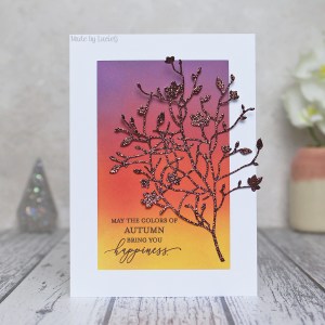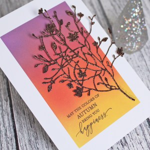 Despite the ridiculous heatwave that we have right now, I decided to create another autumnal card with Penny Black products. I’ve had the beautiful Dancing Branchlets die (51-247) for a while and although I’ve played with it a few times, I’ve never used it on a card. Until now!