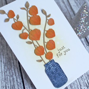 I’ve noticed that I have been using blue/aqua backgrounds a LOT recently so I was determined that my background would not be blue – instead I sponged some Antique Linen distress ink on my card base and lifted some ink using water droplets. Next, I cut my Poppystamps Chinese Lantern die from some kraft card and coloured the lanterns using distress oxide ink and Prismacolour pencils. I used the mason jar from the My Favorite Things Farmhouse Foundations die set to cut some blue patterned paper and adhered my die cuts to the card base. Finally I added a Hero Arts sentiment.