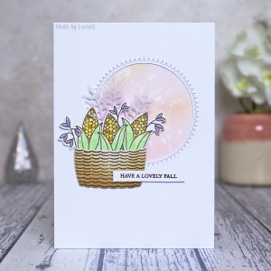 Now for the circle element…. As I mentioned yesterday, I’m on a mission to reduce my dependency on blue/aqua backgrounds. Fortunately this morning, the was the most amazing sunrise, the sky was stunning, dominated by pinks and oranges – and that served as my inspiration! I blended some distress ink across my card base and then cut a circle from a separate piece of card using a die from the Stitched Circles set (51-551) before adhering it to my card base. I then added my corn basket and a few die cut wheatsheaves from the Autumn Decor set (51-653).