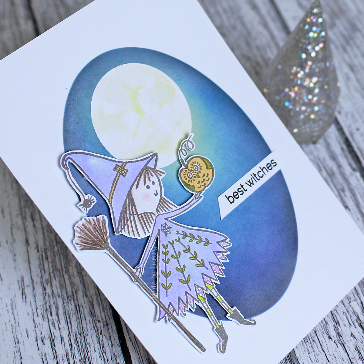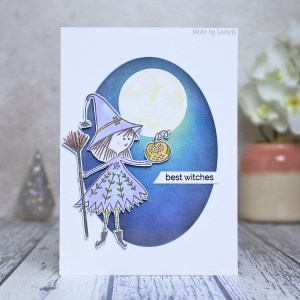 For the background, I cut an oval from some masking paper and added a circle mask. I then blended various colours of Distress Oxide ink (Antique Linen, Salty Ocean, Unchartered Mariner, Chipped Sapphire and Black Soot). Usually I like to have more purple in my Halloween skies but as I wanted to use purple for my Sweet Witch, I decided to stick with blues. Once I finished the blending, I removed the masks and coloured in my moon using regular distress inks and a bit of water.