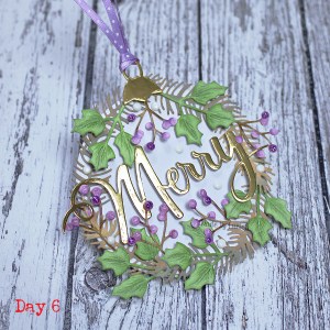 For my take on the wreath tag, I used some die sets kindly sent to me by Penny Black – the Jumbo Bauble set (51-743), part of the big holly stem in the Holly-Days set (51-741), and sprigs from Stocking Stuffers (51-747) and Joy of Giving (51-748). The sentiment is from the Merry Edger set (51-745).