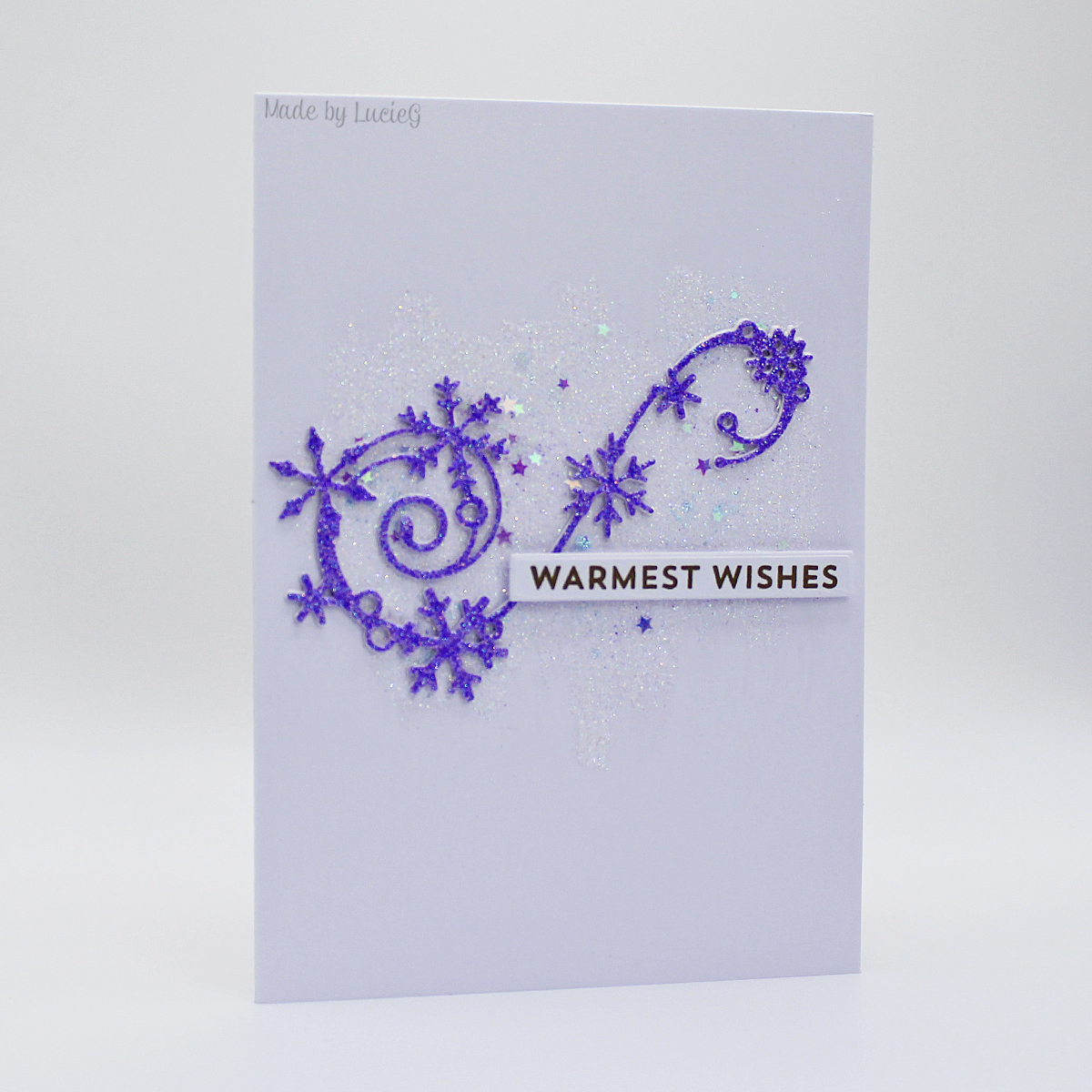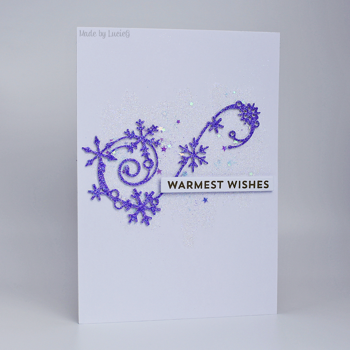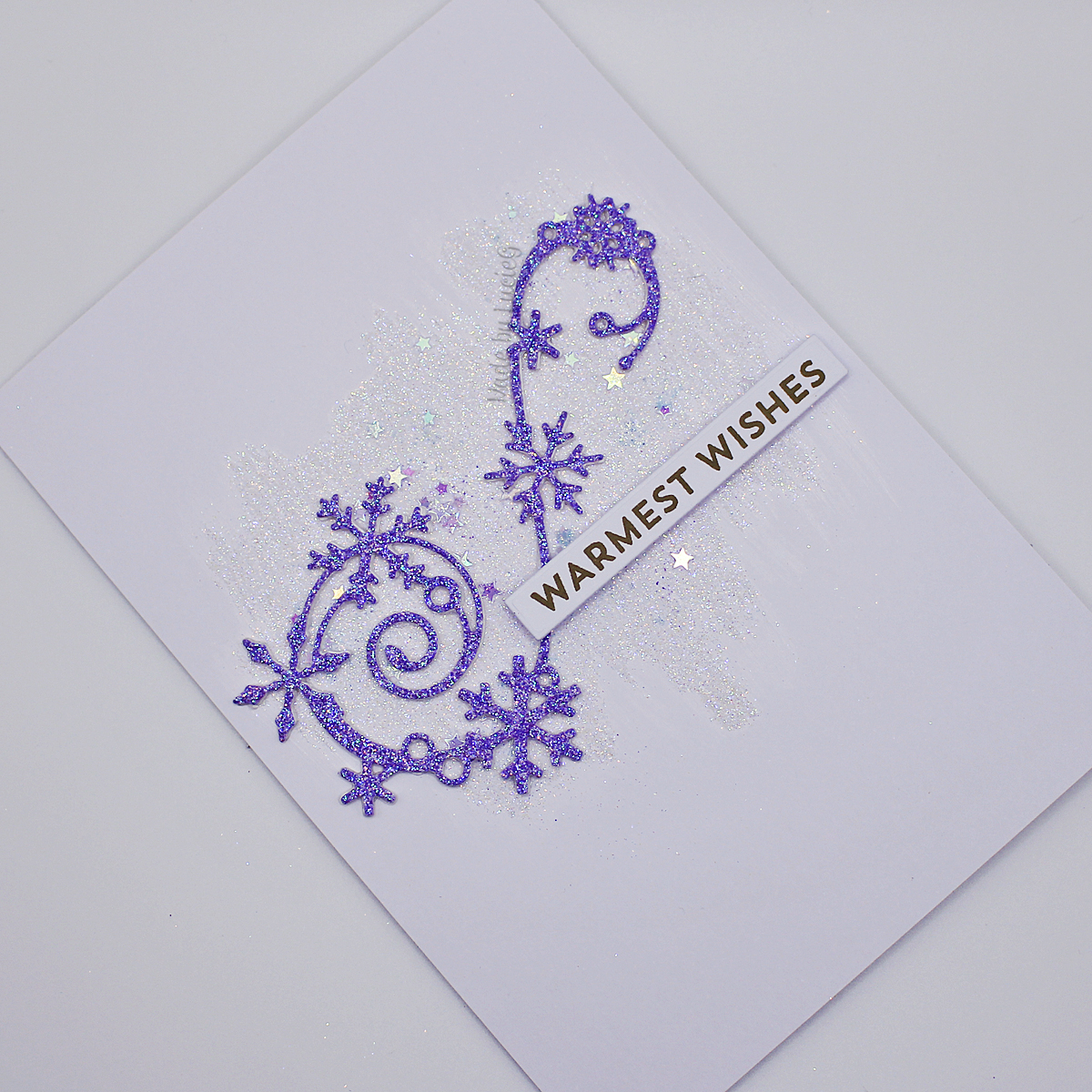 First of all, I applied some distress collage medium to my card base and then added several different glitters. While that dried, I cut the beautiful Elegant Snowflake Flourish die by Memory Box from glitter card and white card and stuck the layers together. Once the glitter background was dry, I adhered the die cut to my card base and added a sentiment by My Favorite Things.