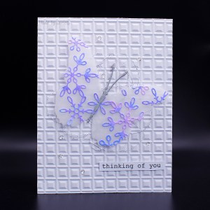 I wanted to use this fabulous Memory Box embossing folder for my card base but felt that the butterfly needed a little something to ground it so added some silvery thread and a few sequins. The sentiment is by Memory Box.
