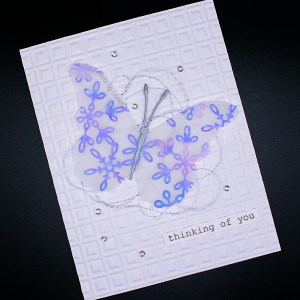 I took a slightly different approach to my card and used the Snowflake Screen with the Josefina Butterfly dies to create a snowflake butterfly! I used an old inky panel for the snowflakes and cut the butterfly from vellum before adhering and then trimming the snowflake screen to size. The butterfly body is from Birch Press Design’s Butterfly Basics set.