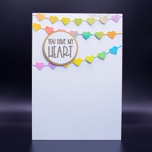 I used a few distress inks to create a blended rainbow panel which I cut three times with the Heart String die (51-022). The sentiment is from the Warm My Heart mini set (30-895)*.
