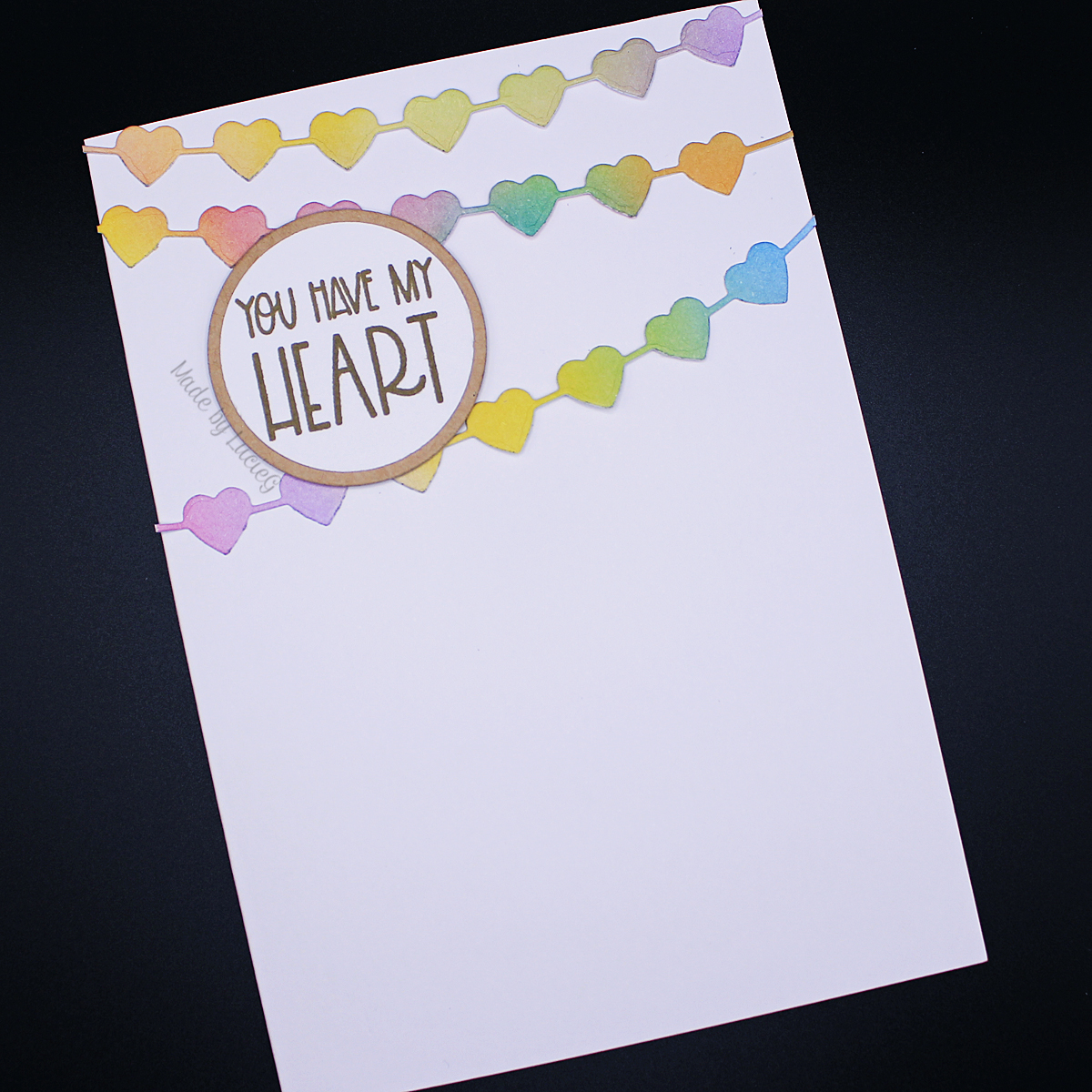 I used a few distress inks to create a blended rainbow panel which I cut three times with the Heart String die (51-022). The sentiment is from the Warm My Heart mini set (30-895)*.