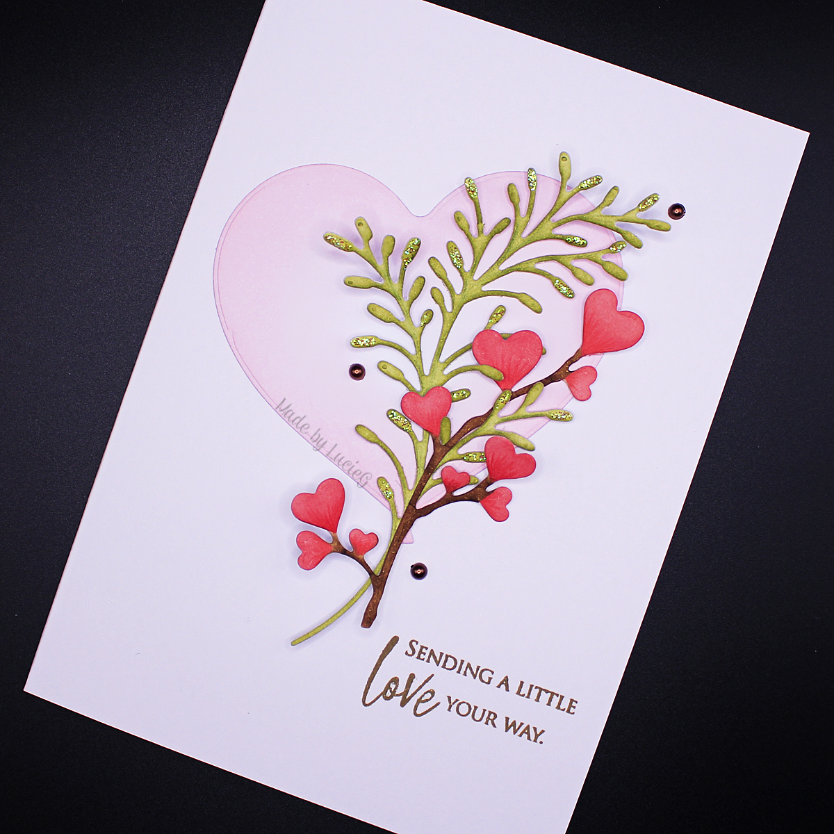 After arranging the die cuts, I stamped a sentiment from the Love Big set (30-898) and few brown pearls.