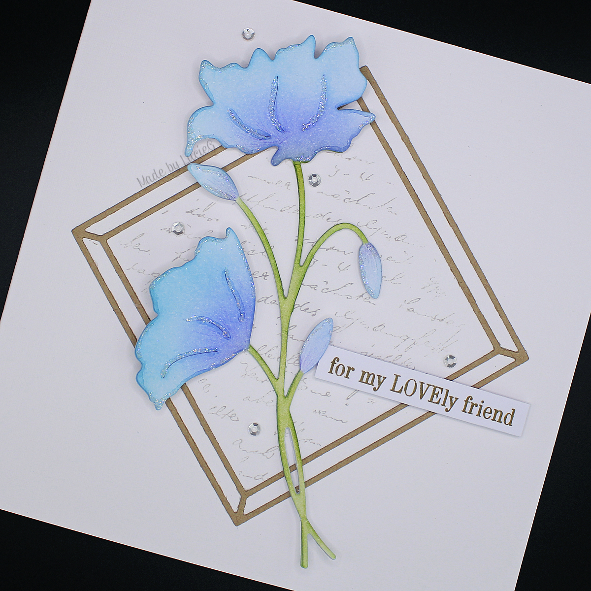 I then turned my attention to the Finesse die (51-769). Again I coloured it with distress inks and added a bit of glitter. While I was waiting for that to dry, I turned my attention to my card base. I adhered the largest die cut from the Framed set (51-622) and then masked it off before stamping the Letter Background (40-780) in the centre. I then adhered the die cut on top and added a sentiment from the Without Limits mini stamp set (30-949).