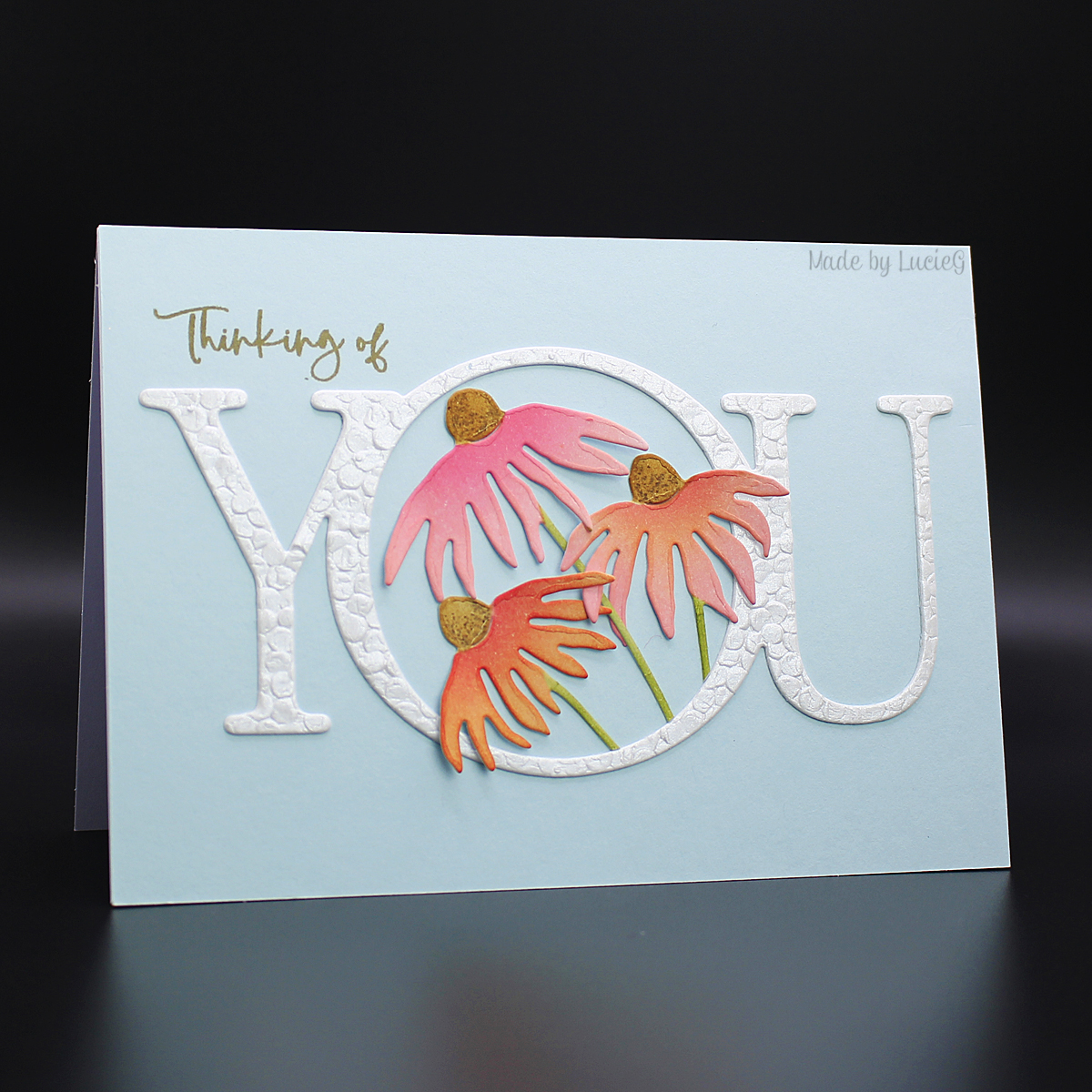 First up is this Thinking of you card, made with a dear friend in mind. I coloured the three daisies from the Delicate Daisies die set (51-763) with distress inks and then tucked them in the centre of that fabulously bold YOU die (51-760)! The stamped ‘thinking of’ is from part of a stamp from the Thinking of You stamp set (30-825).
