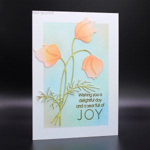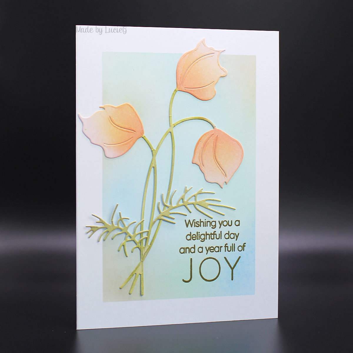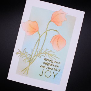 Next up is the Floral Twirl die (51-768) – isn’t that a pretty name! And it is certainly a pretty die! Again coloured with distress inks – and I added some leaves from the An Impression die set (51-735). The sentiment from the Delightful Day stamp set (30-955).