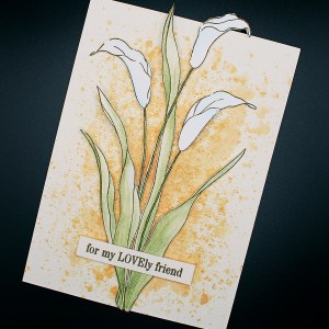 When I saw the combo, I decided to step outside my comfort zone, pull out my watercolour paints and ink up the beautiful new cling stamp called Enchantment (40-885). I have to confess, I get a little nervous water colouring such a large stamp but I really enjoyed the process – the stamp was much easier to colour than I was expecting! While it was drying, I smooshed some brown distress ink onto a cream card base. I then fussy cut the image (which was also pretty easy) and adhered it to my card base with a few sticky fixers.