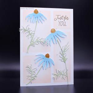 I coloured the three daisies from the Delicate Daisies die set (51-763) with distress inks and arranged them on my background. Even thought I’m a CAS cardmaker, I felt that the card still needed something else, so I added some leafy fronds from the An Impression die set (51-735).